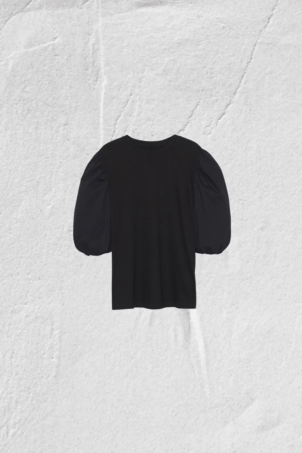 Remera cuello redondo confeccionada en algodón pima 100%. Mangas 3/4 confeccionadas en poplín, se destacan por el volumen que le genera a la prenda . Una prenda de corte cuadrado y fit holgado. Artículo versátil para utilizar tanto de día como de noche.